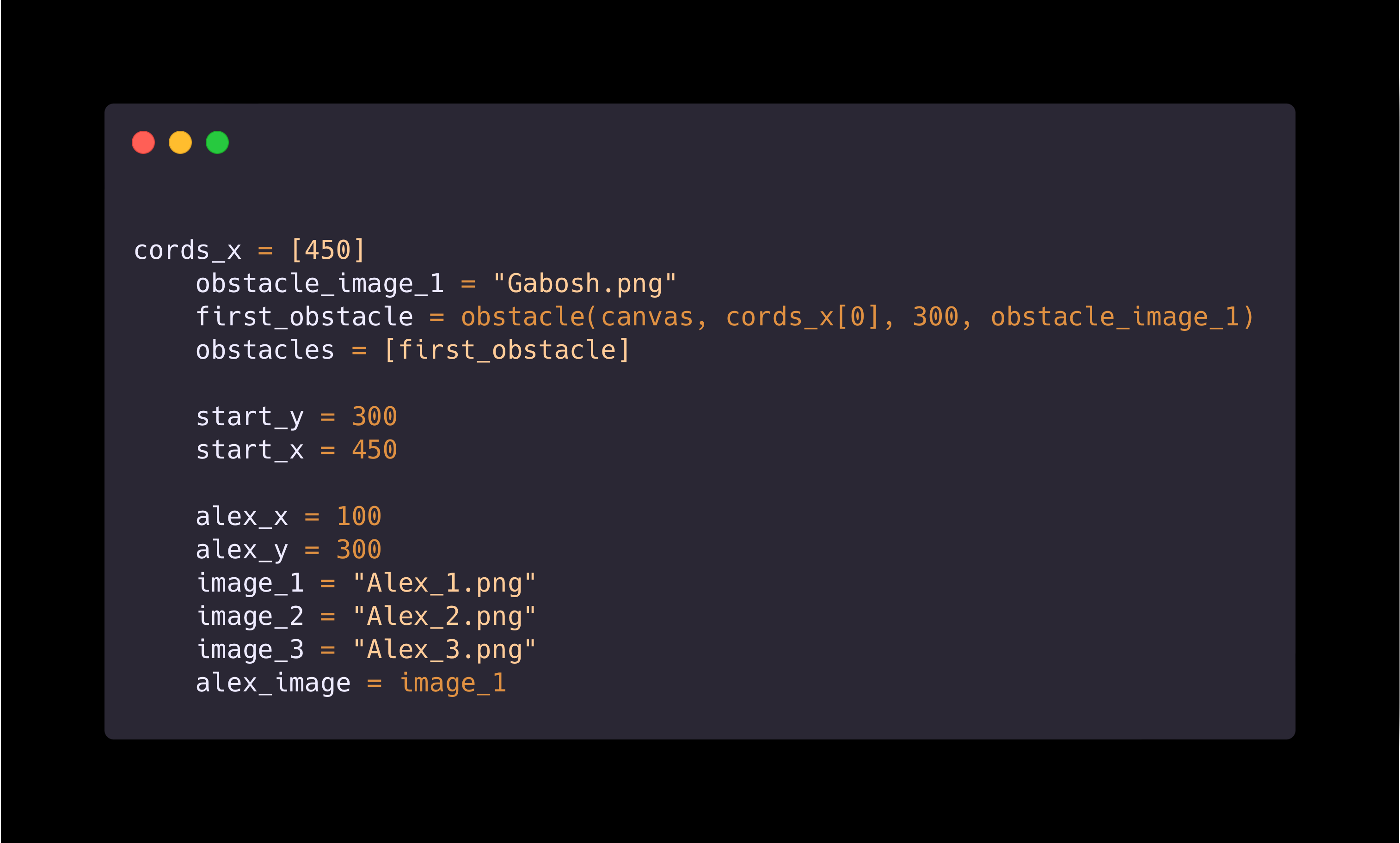I initialized the obstacles and the main character, Alex, with initial positions. Alex has three images to create a simple running animation.